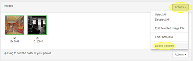Une fois la ou les photos sélectionnées, cliquez sur le bouton Actions à droite et choisissez Supprimer la Sélection Il y a des boutons Actions en haut et en bas du champ Images sur le côté droit pour plus de commodité. Les boutons Action fonctionnent tous les deux de la même façon.