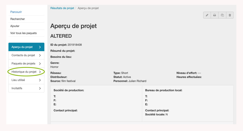 Sur la page Aperçu du projet, sélectionnez l’onglet Historique du projet sur le côté droit de votre écran.