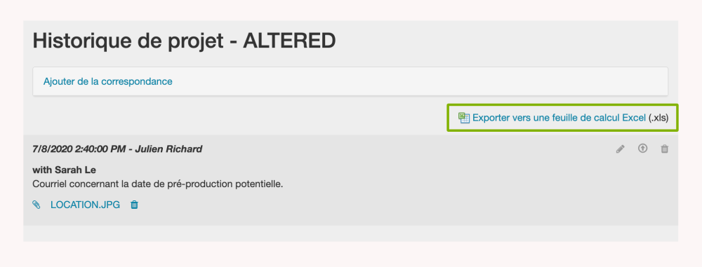 La page Historique du projet contient une liste de toute la correspondance associée au projet. Pour exporter la liste de la correspondance en format Excel, cliquez sur le lien Exporter vers une feuille de calcul Excel (.xls) situé à droite de votre écran.