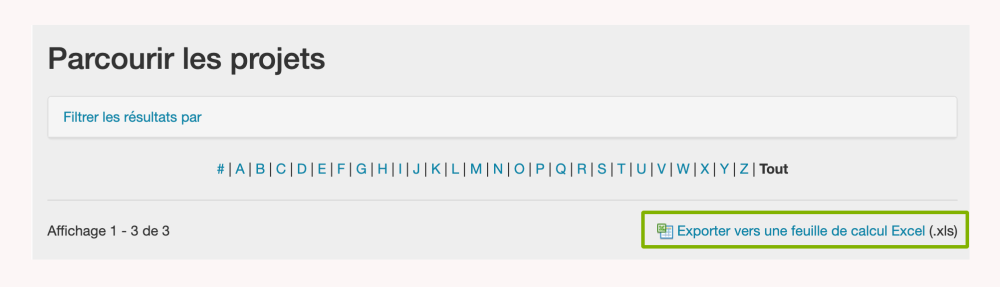 Repérez le lien Exporter vers une feuille de calcul Excel (.xls) dans la partie supérieure droite de la page Parcourir les projets. Cliquez sur ce lien pour ouvrir une boîte de dialogue.