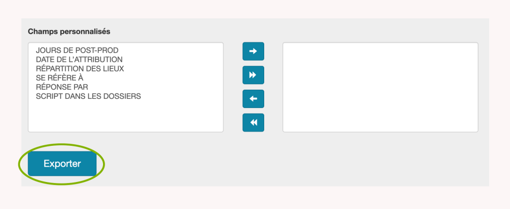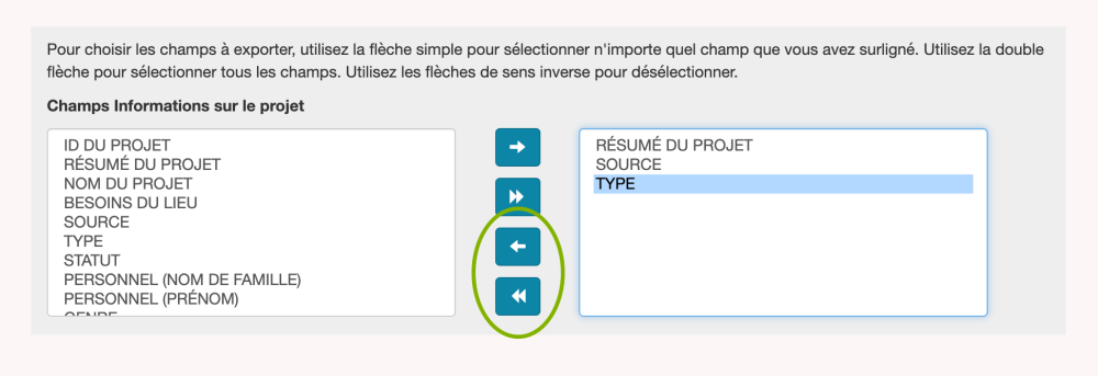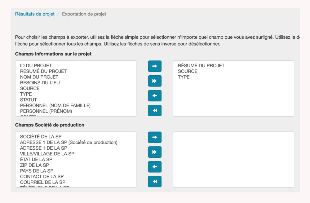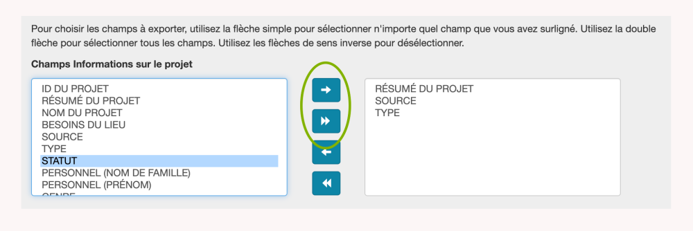 Pour ajouter un seul champ parmi les options disponibles à votre exportation, cliquez sur le type de données que vous souhaitez ajouter. Une fois que le type de données est mis en surbrillance en bleu, sélectionnez la flèche pointant vers la droite. Ce champ apparaîtra alors dans la feuille de calcul Excel téléchargée. Pour ajouter à votre exportation tous les types de données dans une boîte, cliquez sur le double triangle pointant vers la droite. Il n’est pas nécessaire de mettre en surbrillance les types de données dans la colonne des champs disponibles pour accomplir cette tâche.