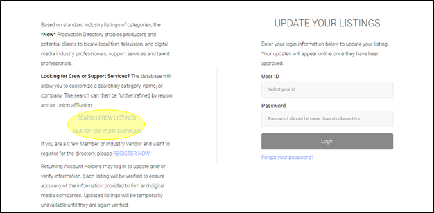 Vous pouvez ouvrir l’inscription pour le répertoire et les entreprises de services d’assistance. Pour ouvrir l’inscription, il suffit de donner accès à ce lien – http://demo.reel-scout.com/crew_login.aspx – à partir du site Web de votre bureau du film.