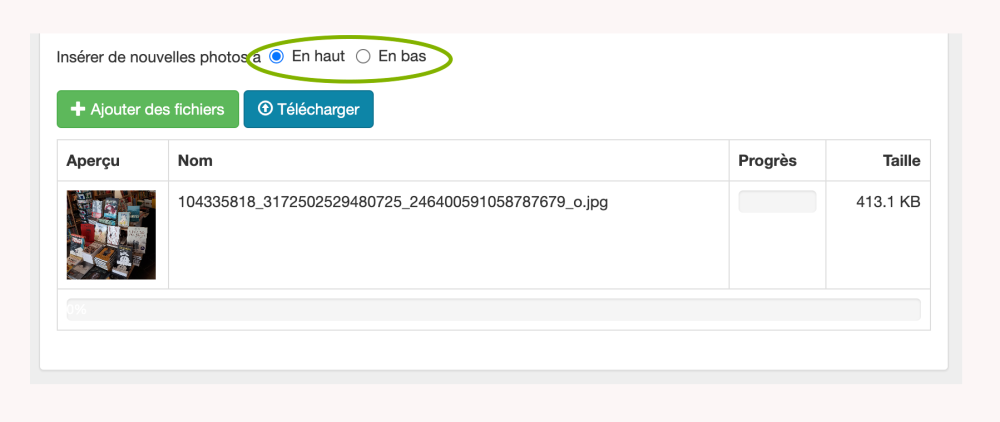 Avant de cliquer sur Télécharger, vous pouvez utiliser les cases à cocher pour choisir si les nouvelles images apparaîtront en haut ou en bas de la liste.