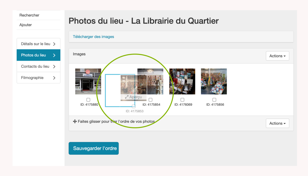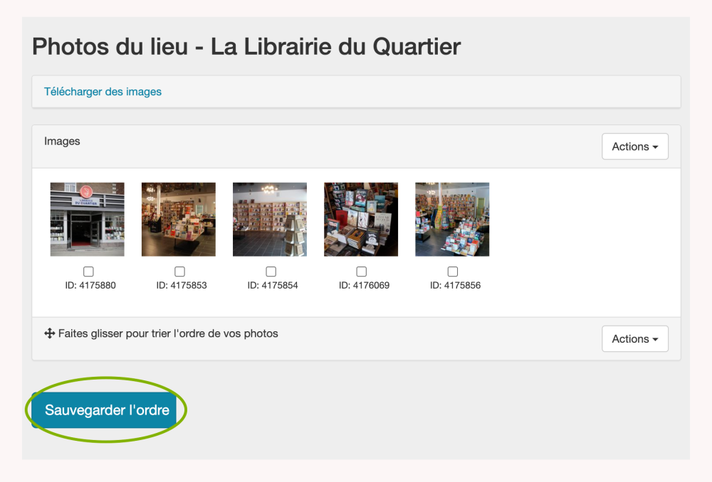 Lorsque vous avez placé vos images dans l’ordre que vous désirez, cliquez sur le bouton Sauvegarder l’ordre. Si vous ne cliquez pas sur Sauvegarder l’ordre, vous devrez recommencer votre travail.