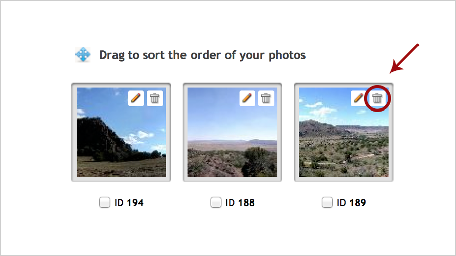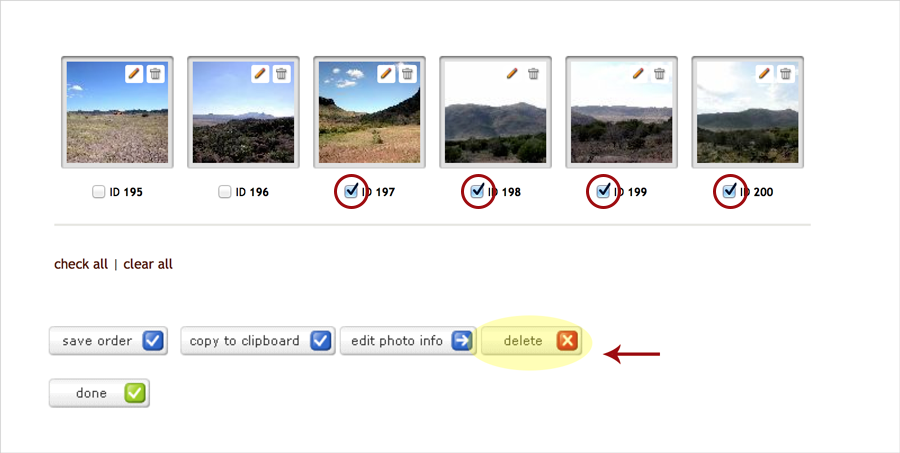 To delete multiple images at a time, click the checkbox beside the photo ID under each thumbnail image and then click the DELETE SELECTED button. You will be asked to confirm the deletion. Click ‘yes’ when prompted to confirm.