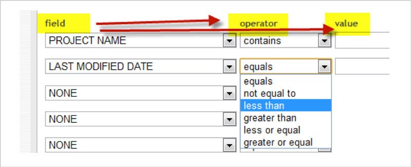 To search for all projects not modified after a certain date, select DATE LAST MODIFIED, select LESS THAN, and select the date in question.