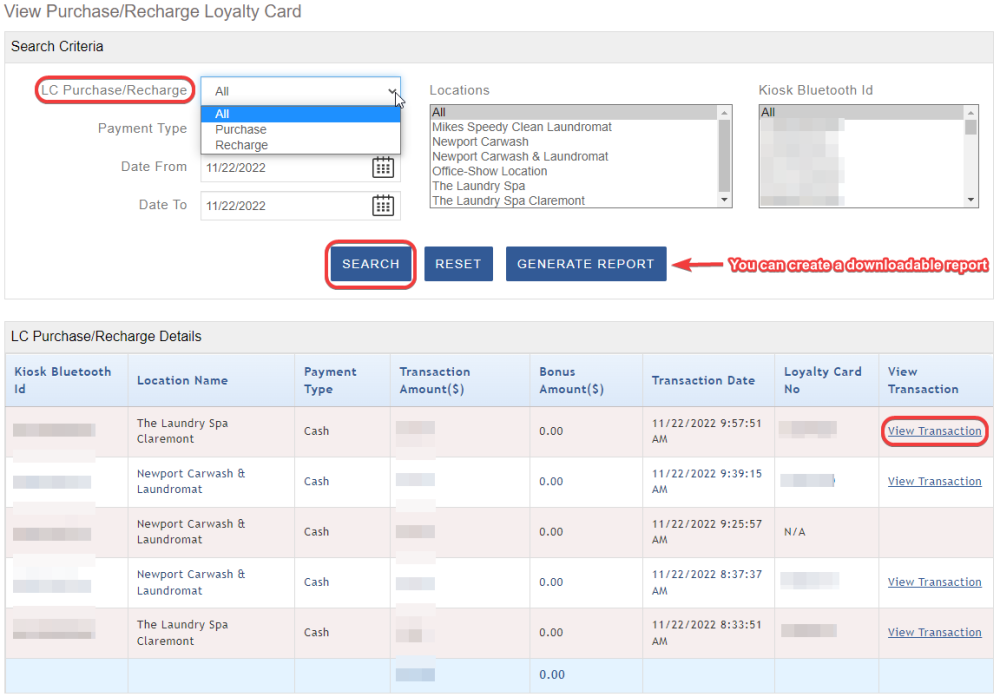 Here is where you can search for kiosk transactions.