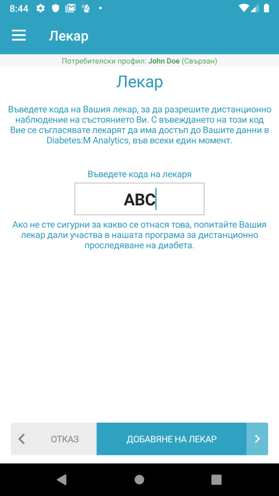 Отворете плъзгащото се меню от ляво и натиснете върху опцията “Лекар”. Ако все още нямате добавен лекар тогава ще се появи екрана за въвеждане на код на лекар, а иначе ще се появи списък с вече въведените лекари. Когато е въведен кодът, Diabetes:M ще чака лекарят да приеме заявката. Дотогава в информационния екран на лекаря ще се вижда съобщението “Изчаква се съгласието на лекаря”.