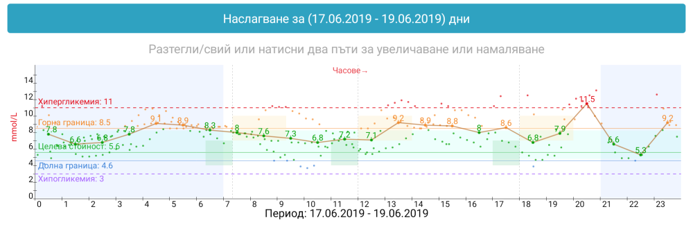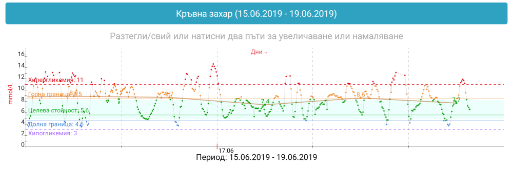 Тази графика показва историята на всички проверки на кръвна захар за избрания интервал от време. Средните стойности са изчислени на база ден. Можете да разберете как някои събития влияят върху управлението на вашият диабет. Ако например сте били на почивка за няколко дни, можете да видите средните стойности за тези дни тук.