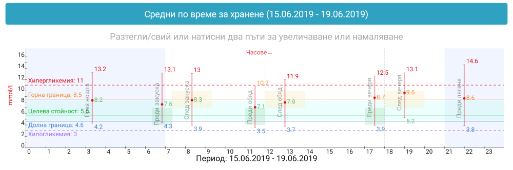 Тази графика показва минималните, максимални и средни стойности на кръвна захар според категориите за хранене. Тази информация може да ви помогне да откриете дали има твърде големи отклонения в кръвната захар в рамките на деня. Възможно е да имате добри средни нива на кръвна захар, но ако има твърде големи вариации, това не е добър знак за контрола на вашия диабет.