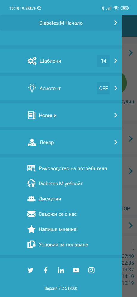 - Smart Assistant – включване и управление на Smart Assistant. Вижте тази страница за повече информация: https://sites.google.com/view/diabetes-m-userguide/smart-assistant