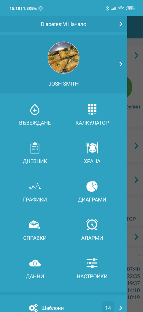 - Шаблони – функционалност която намира потенциални проблеми в терапията ви чрез анализ на въведените записи и данни от последните 14 дни, по критериите на предварително определени шаблони.