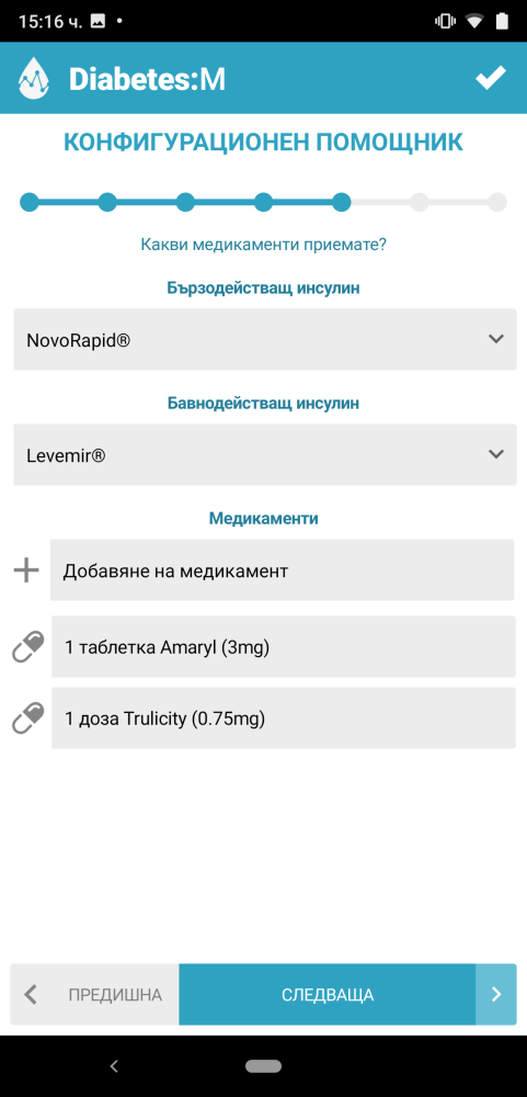 При Лечение без инсулин приложението ще ви предостави възможност да добавите медикаментите които приемате, както и дозите, които да се ползват по подразбиране.