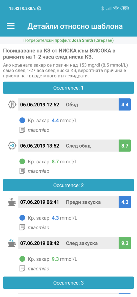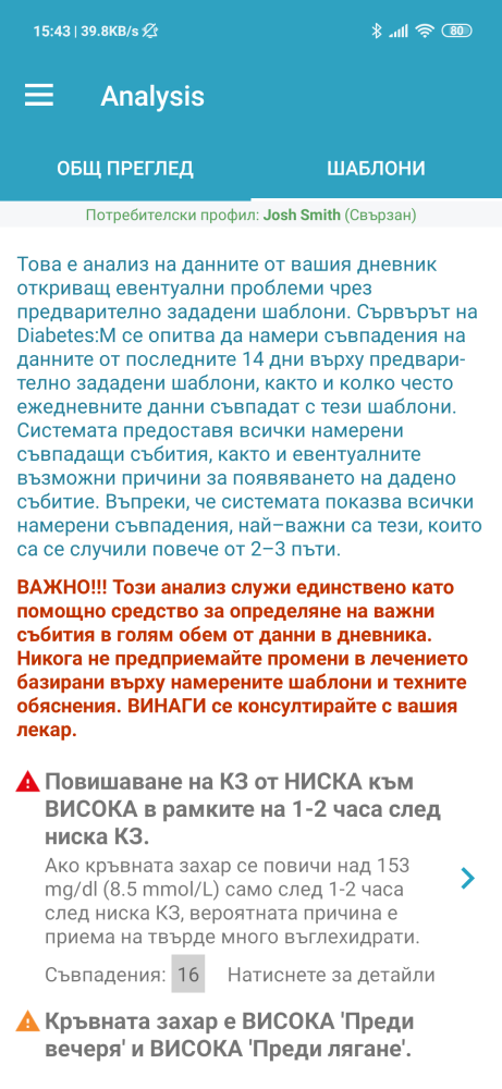 Функцията, създаваща шаблони анализира всички записи от последните две седмици и търси общи тенденции в нивата на кръвната захар. Колкото повече записи имате – толкова по-добре работи анализът. Ако бъде намерен шаблон, услугата ще покаже всички свързани записи в дневника, както и някои предложения защо това конкретно повтарящо се събитие може да се случи. Това ще помогне на Вас и Вашия лекар да откриете потенциално проблемни събития в хода на Вашето лечение, които лесно да коригирате.