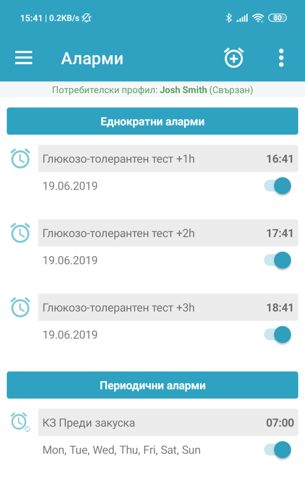 Тук потребителите могат лесно да създават аларми за напомняне. Има два вида аларми – повтарящи се и еднократни. И двата вида могат да задействат аларма в точно време и 2 часа след посоченото време за допълнителна проверка на кръвната захар.