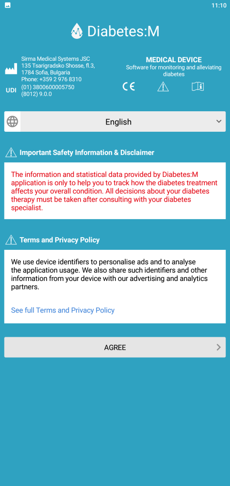 On the first screen Diabetes:M will request you to read and agree with the user privacy policy and accept the disclaimer.