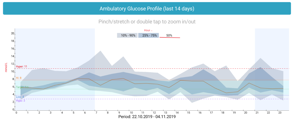Ambulatory Glucose Profile (AGP) is a chart for interpreting a patient’s daily glucose and insulin patterns. AGP chart provides graphic characterizations of daily glucose patterns. It shows the 10%-90% and 25%-75% percentiles zones and 50% median line of all the glucose readings for the selected interval during 24 hours. This helps to see for which hours you glucose varies the most.