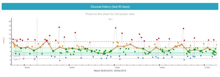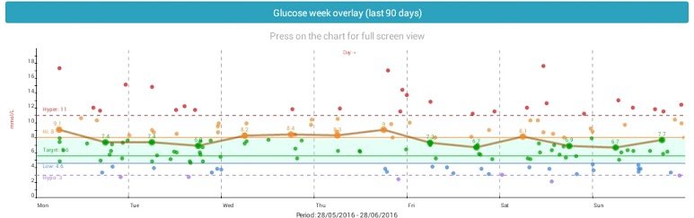 This chart shows the history of all the glucose readings for the selected interval. Averages are calculated per day. You can find out how some events affected your diabetes management, for example if you were on a vacation for a few days, you can see those days averages here.