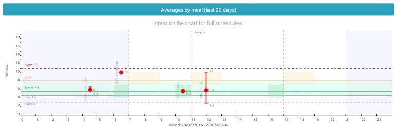 This chart shows the minimum, maximum and average values of blood glucose per meal categories. The chart can help you find if you have too big deviations of the blood glucose during the day. Usually you may have good average glucose values, but if you have big deviations it’s not a good sign for your diabetes management.