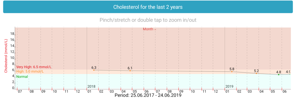 This chart shows the history of all cholesterol recordings for the last 2 years.