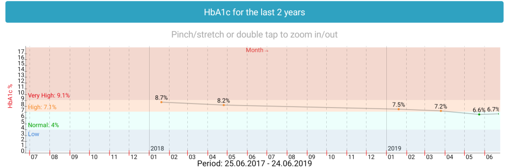 This chart shows the history of all the HbA1c recordings for the last 2 years.