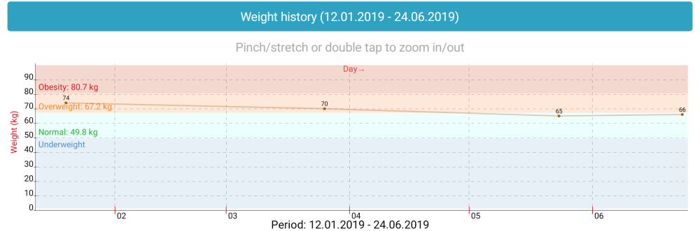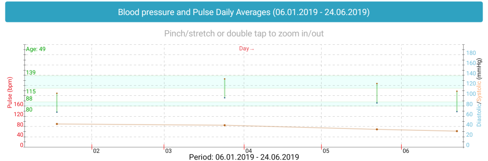 This chart shows the history of all the blood pressure and pulse recordings for the selected interval.