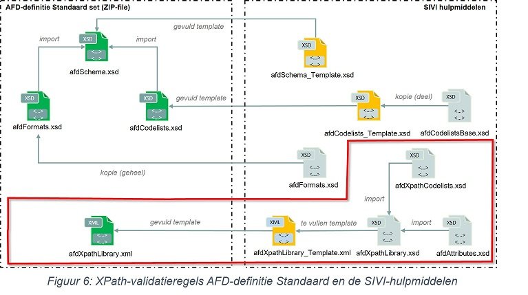 Het hulpmiddel afdXPathLibrary_Template.xml is gegenereerd uit het* XML Schema afdXPathLibrary.xsd*. Dit XML Schema maakt gebruik van de twee ondersteunende hulpmiddelen afdAttributes.xsd en afdXPathCodelists.xsd. Het XML Schema afdAttributes.xsd bevat alle AFD-entiteiten en attributen. In het XML Schema afdXPathCodelists.xsd staan de AFD-codelijsten die van toepassing zijn voor de AFD verbandcontroles. Er zijn bij deze schema’s geen extra acties nodig om het XML-bestand afdXPathLibrary_Template.xml te genereren.