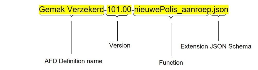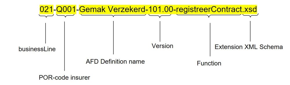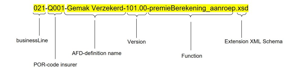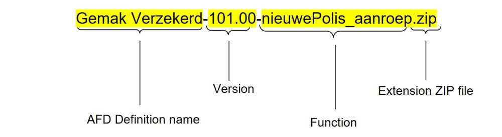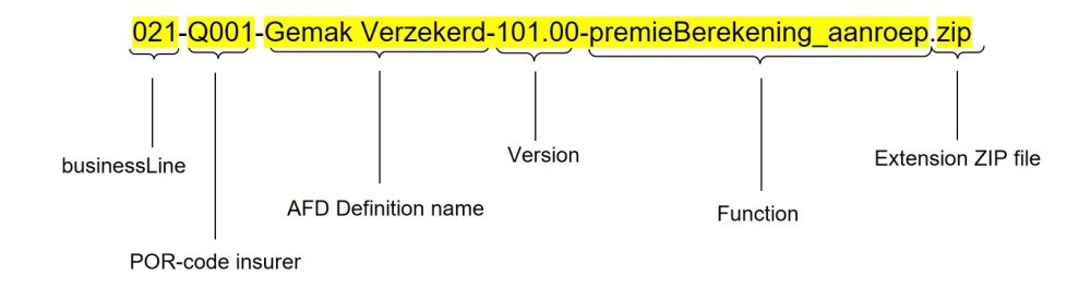 Composition of the file name for the zip file containing the AFD-definition for the function ‘nieuwePolis_aanroep’. The business line (branchecode) and the company name description (POR-code) are optional in a generic AFD-definition and are omitted in this example: