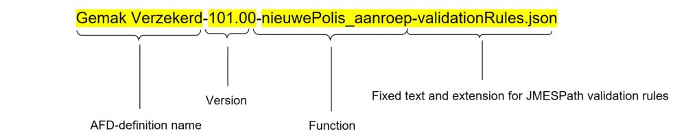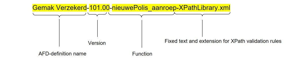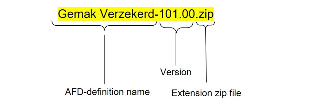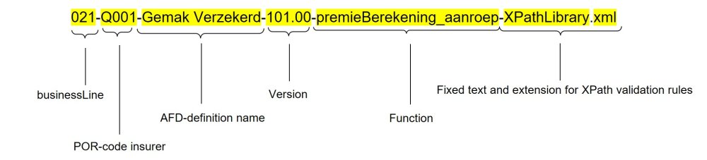 An AFD-definition contains one or more functions. Functions can be defined in the tooling AOS. For each function a different (partial) AFD-definition is composed. The file name for the generic AFD-definition of a function contains at least the AFD-definition name, the version and the name of the function. The business line (branchecode) and company name description (POR-code) can be part of a generic AFD-definition name, but are not mandatory: