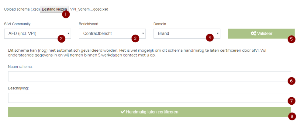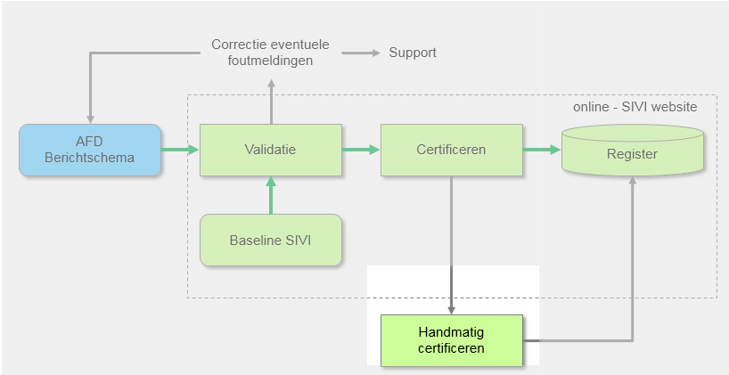Wanneer voor een combinatie van definities (SIVI Community/Berichtsoort/Domein) (nog) geen baseline beschikbaar is kan tot handmatige certificering worden overgegaan. De validatie en certificering wordt dan niet door de tool online afgehandeld maar door de medewerkers van SIVI. Binnen 10 werkdagen koppelt SIVI terug of het schema gevalideerd en gecertificeerd kan worden. Is het schema correct dan wordt deze door SIVI opgeslagen binnen het account van de gecertificeerde organisatie. De gebruiker(s) binnen de organisatie met de certificeerrol kan een schema publiceren (of intrekken) in het register.