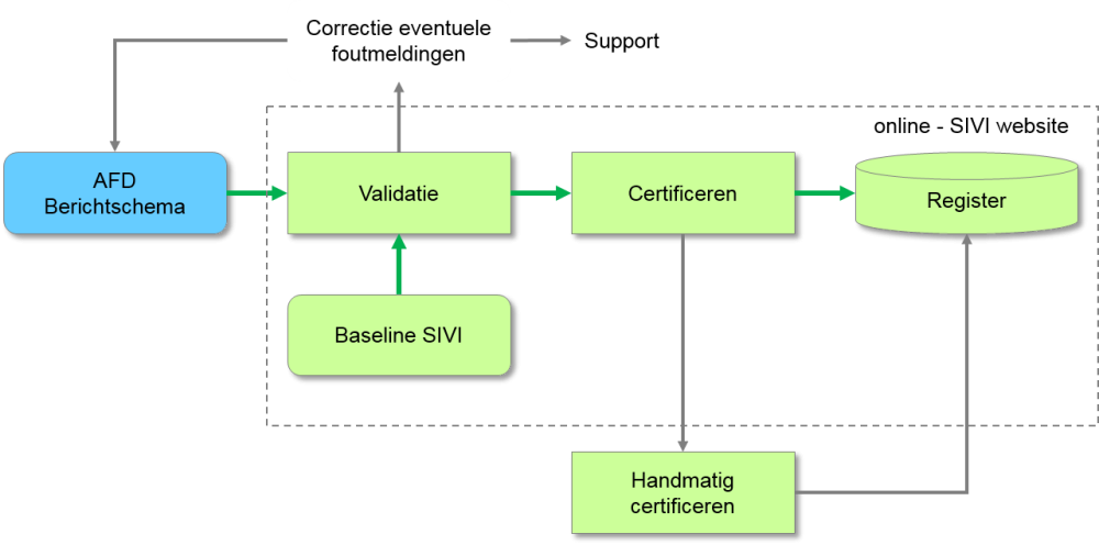 Voor toepassingsgebieden/productgroepen waarvan SIVI het nodig acht is een handmatige certificeringsflow in de tool opgenomen. De validatie en certificering wordt dan niet door de tool online afgehandeld maar door de medewerkers van SIVI. Binnen 10 werkdagen koppelt SIVI terug of het schema gevalideerd en gecertificeerd kan worden. Is het schema correct dan wordt deze door SIVI opgeslagen binnen het account van de gecertificeerde organisatie. De gebruiker binnen de organisatie met de certificeerrol is altijd degene die een schema kan publiceren (of intrekken) in het register.