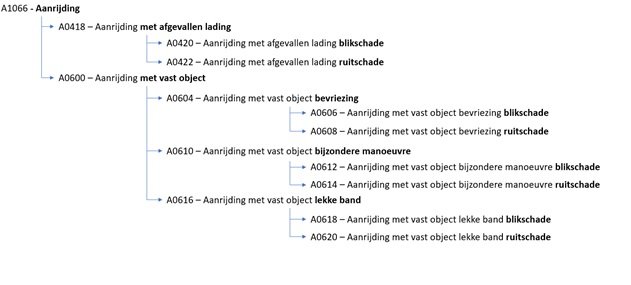 An example of this is the codelist AFDSCL (damage classifications). Sometimes the classification collision suffices, but for other parties the specific classification collision with fixed object or even collision with a fixed object and damage to the bodywork is more relevant. This requires a method to model the relationship between data within a codelist.
