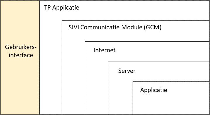 Het aanroepen van het SIVI Koppelingsprotocol gebeurt doorgaans door middel van een SIVI Communicatie Module (GCM). Dit een tussenprogramma, dat de verbinding gaat leggen met de server van de 2e Omgeving. - Internet