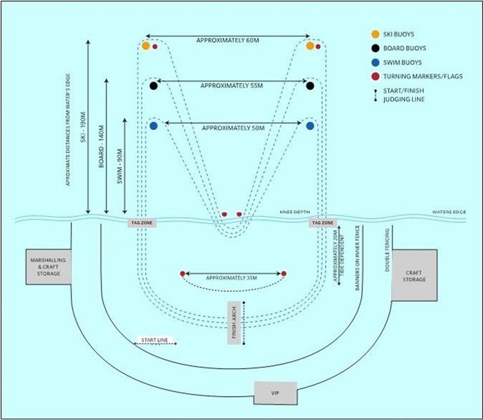 Note: The layout of the competition arena, including the beach setup relative to the positioning of the buoys, may be adjusted dependent upon the prevailing surf, sweep, and beach conditions.