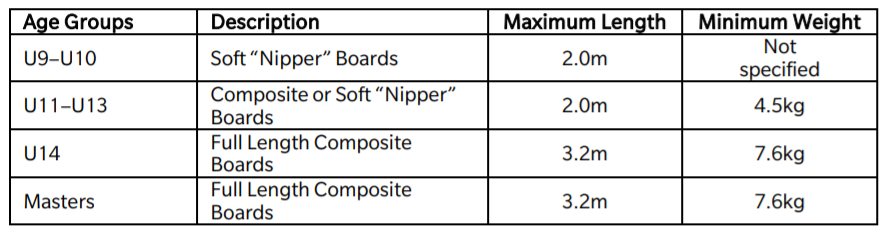 Note 4: Proficient U10 competitors with their relevant age award may compete in U11 age category team events but will be required to use foam or fibreglass boards with the minimum weight of 4.5kg designated for the U11–U13 board.