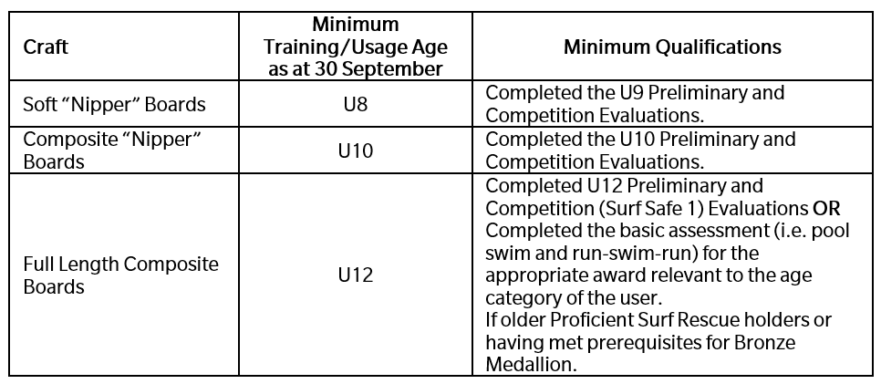 (b) The minimum ages and qualifications for training/usage of SLSA owned Surf Boards is as follows: