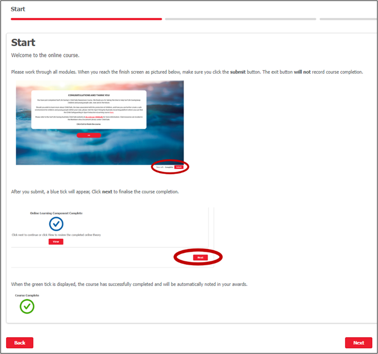 Note – the CRYMS and CSA awards have been merged into a single course. If one award is showing Red, but the other Green, you must still complete the combined course. - Once you have clicked into the course you will be greeted with the instructions page, detailing how to complete the eLearning. See below: