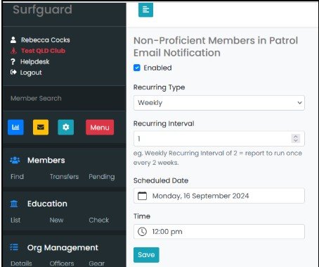 This feature in Surfguard enables clubs to schedule an email notification that will be sent to the Lifesaving (Officer Position) , Education (Officer Position) and Patrol Captain(s).