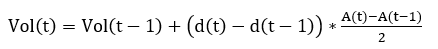 where Vol is cumulative ponding volume up to specified depth (m³); d is depth; A is Area at specified depth (m²); t is the last time step.