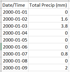 An example of continuous rain data in CSV file is shown as below. Please download the CSV file template of continuous rainfall data.