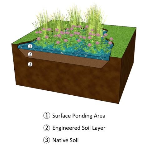 Rain gardens generally function as a stormwater filter and infiltration practice which can be used to temporarily store, treat and infiltrate runoff. The LID is designed with an engineered soil layer to store and treat runoff which then infiltrates into surrounding native soil. Rain gardens are designed with an overflow and a native soil infiltration rate. Key features for rain garden designs are shown in the diagram below.