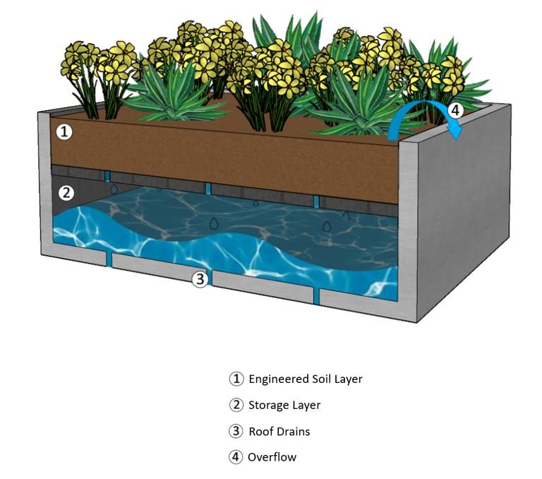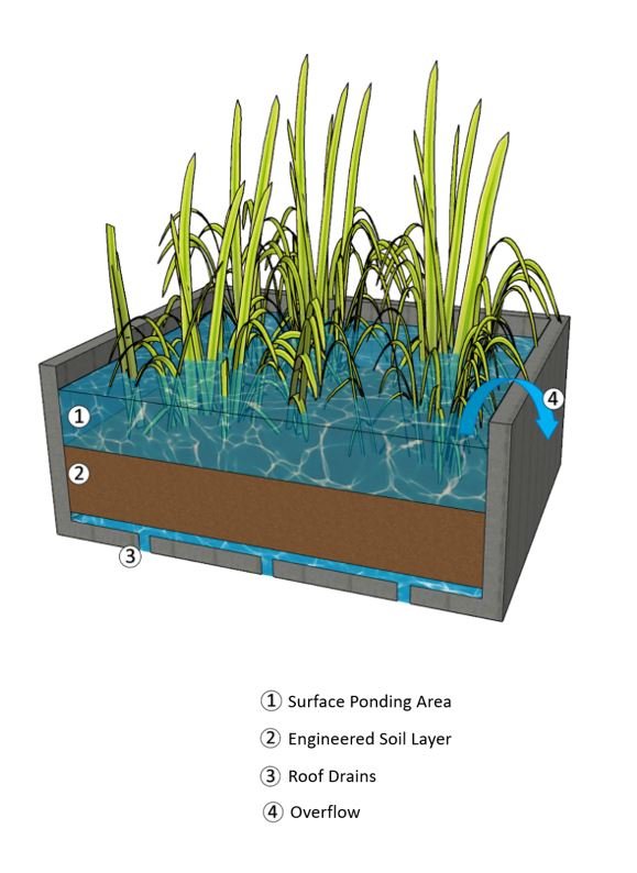 Green roofs are covered with growing media and vegetation that enable rainfall infiltration and evapotranspiration of stored water. They are particularly cost-effective in dense urban areas where land values are high and on large industrial or office buildings where stormwater management costs are likely to be high. In VO6, users could have two options for designing green roof, including subsurface ponding and surface ponding types. The difference between the two types is water storing in different layers. In surface ponding types, users could set a parameter for a depth of ponding layer, while in subsurface type, a depth would be set in the storage layer. Both types have roof drains to convey storm water to drainage sewer or retaining area. Key features for green roof are shown in the diagram below.