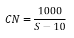 CN can be obtained from tables based on land use, soil type and soil moisture conditions. However, the soil moisture is determined only for three antecedent moisture conditions (AMC), classified on the basis of precipitation in the previous 5 days. CN has no intrinsic meaning but is only a non-linear transformation of S, which is a storage parameter. CN varies from 0 (Q=0 for all P) to 100 (Q=P for all P). In Eqn. 8, the 10 and 1000 have inch dimensions. Conversion can be made to the metric system.