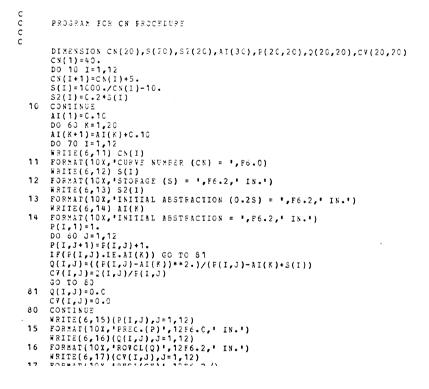 Background information on the derivation of the procedure can be found in a paper by Rallison and Cronshey (1979). In the mid-50s when the SCS CN procedure was developed, the only data available were daily precipitation and runoff records from agricultural watersheds and infiltration curves from infiltration studies. Rainfall versus Runoff (P vs Q) data were plotted. A grid of plotted CN for = 0.2S was then overlaid and the median CN selected. The values in the SCS NEH-4 manual (1971) represent the averages of median site values for hydrologic soil groups, land cover and hydrologic conditions. The SCS work involved considerable interpolation and extrapolation for different soil types and land cover. The rainfall versus runoff plots were also used to define enveloping CN for each site.
