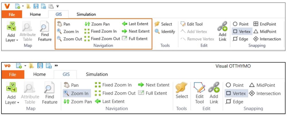 To zoom in and out of the map, wheel the scroll mouse up and down. More navigation tools are available in GIS tab and they are shown below. These tools are described in Table 4-4. The Pan tool is also available from the context menu. Note that in TatukGIS, the Zoom Out button is not available. Instead, To Zoom In, the user can click on the Zoom In button followed by clicking and moving the mouse to the right side to form a rectangle. To Zoom Out, follow the same step above but forming the rectangle towards the left after clicking on the map. The user can always use the scroll mouse to zoom in and zoom out. Identify button is only available in ArcGIS. Multi-selection of Snapping tools is available only on ArcGIS.
