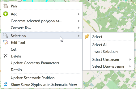 Similar as in Schematic View, certain hydrologic objects can be selected by using the Selection context menu. These menus are described in 6.3.