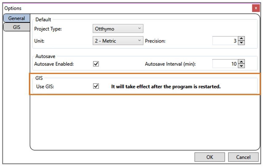 By default, VO 6.0 will load the TatukGIS map functions. When an ArcGIS license is available, the user can choose ArcGIS from the GIS Type selection drop-down menu.. This can be changed in Options window as shown in the figure below. Uncheck the Use GIS option in General tab. Note that this option only appears when ArcGIS license is available, and the change will take effect after the program is restarted.