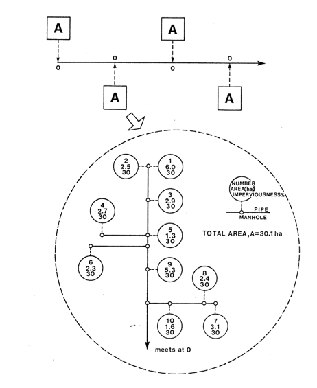 On two of the catchments the urban area routine URBHYD of OTTHYMO was used. Impervious conditions of 35% and 50% were used on urban catchment No.1 to observe the change in difference between the design storm peak flows. On the third urban catchment the SWMM simulation program was used. A schematic of this catchment is shown in the figure below.
