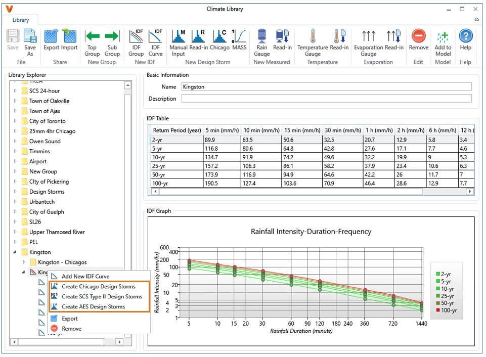 Chicago, SCS Type II and AES design storms can also be created based-on IDF Group as shown in the figure below. The design storms are created for each return period in the IDF Group.