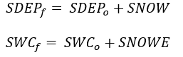 SWC = the solid (ice) water content (mm), the subscripts o and f denote the initial and final values of certain quantities (e.g. SWC) at the time of the calculation,